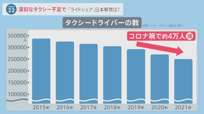 全国ハイヤー・タクシー連合会によりますと、ドライバーの数はコロナ禍もあり、2019年度から2021年度までの3年間で約4万人が減少。稼働する台数も大幅に減っているといいます。