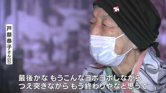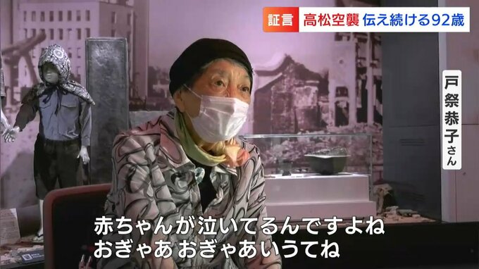 (戸祭恭子さん)「赤ちゃんが泣いてるんですよね。おぎゃあおぎゃあいうてね。本当にお母さんは亡くなってるんですよね。それをやっぱり赤ちゃんわからないからね、おっぱいこうやってね。『誰かこの赤ちゃんだけでも助けてあげて』いうて、それこそ、その時もわれかまわずおらんだんですけど(叫んだ)、だれも助けませんよね。そんなん、その時に自分はまだ14歳で小さいから助けてもよう育てんし、そのままほっといて逃げたのが気になって、やっぱり夏が来ると思い出します」