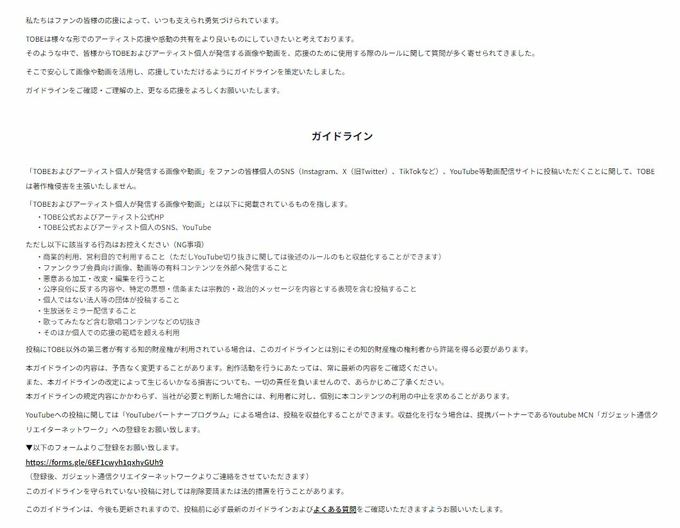 公式サイトでは「私たちはファンの皆様の応援によって、 いつも支えられ勇気づけられています。TOBEは様々な形でのアーティスト応援や感動の共有をより良いものにしていきたいと考えております。」とし「そのような中で、 皆様からTOBE およびアーティスト個人が発信する画像や動画を、 応援のために使用する際のルールに関して質問が多く寄せられてきました。そこで安心して画像や動画を活用し、 応援していただけるようにガイドラインを策定いたしました。」と報告しました。