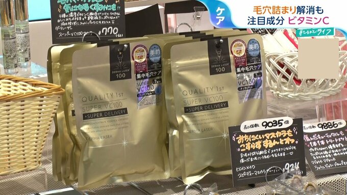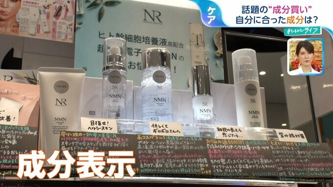 売り場にはレチノール・ヒアルロン酸など、美容成分が目立つような形で表記されています。