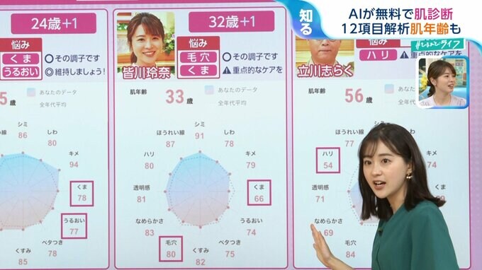 皆川玲奈アナウンサーは、実年齢+1歳の33歳という肌年齢。