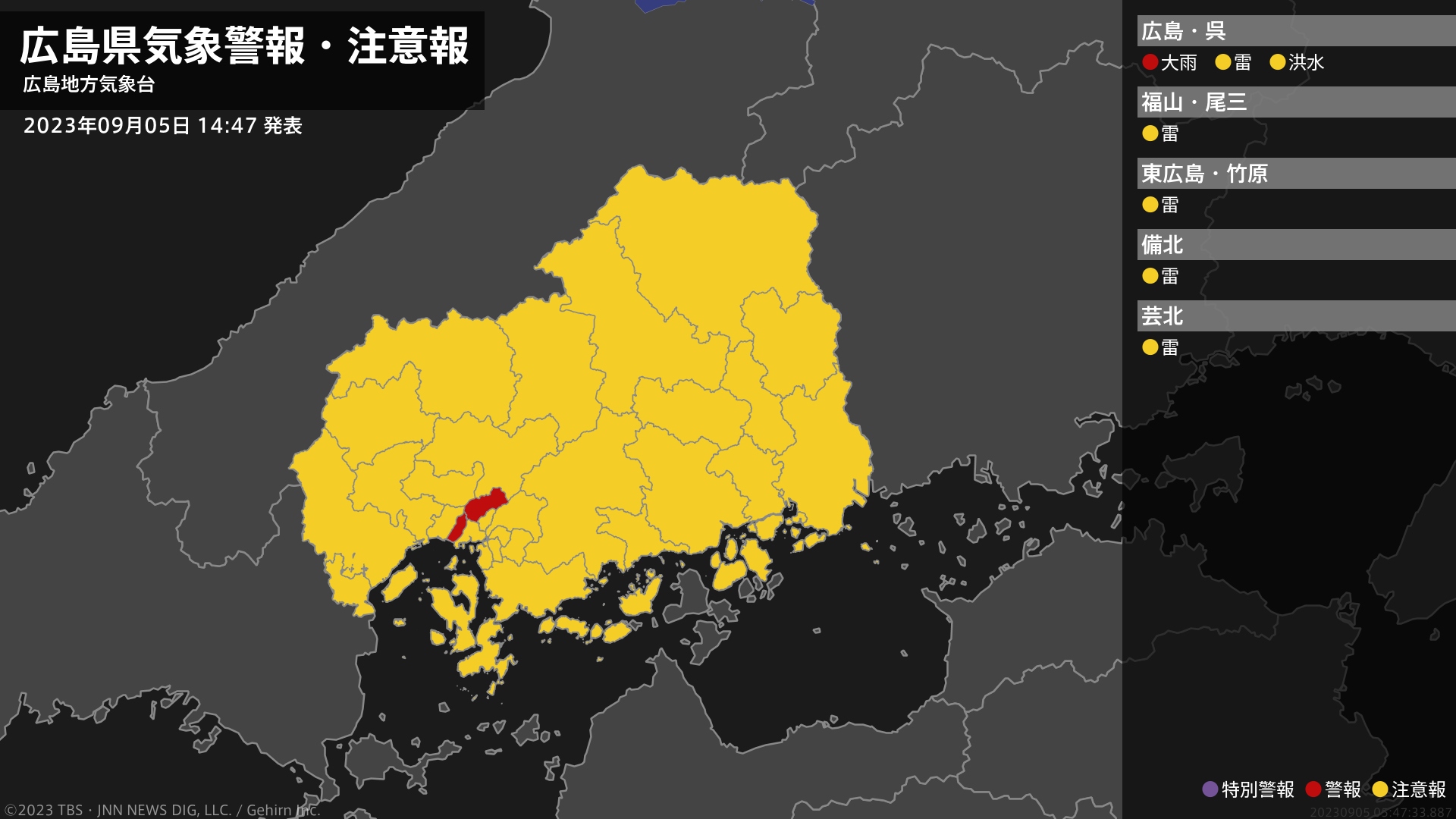 気象台は、午後2時47分に、大雨警報(浸水害)を広島市中区、広島市東区に発表しました。