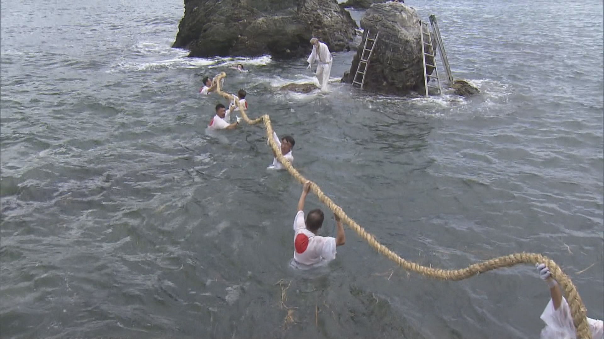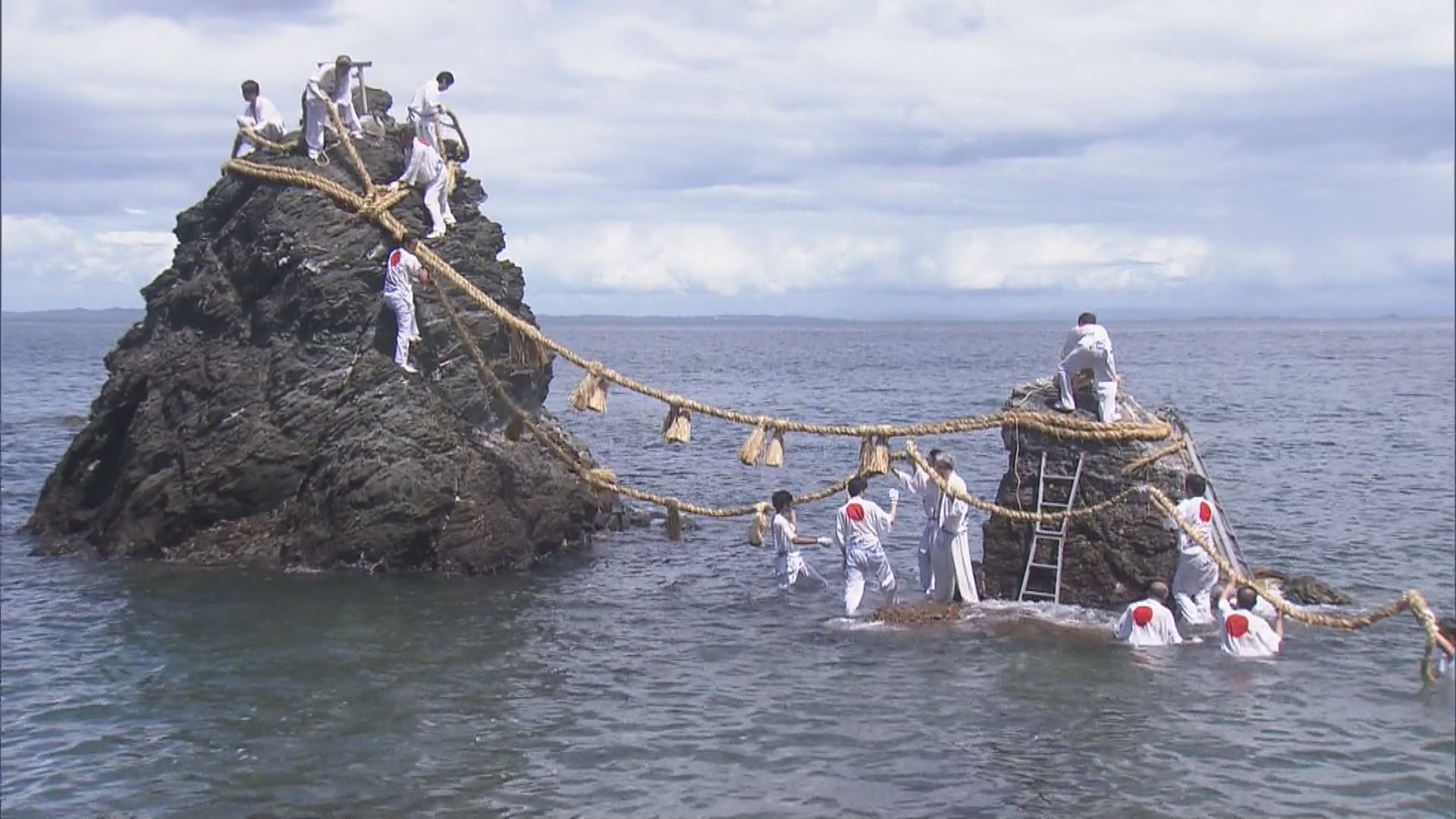 三重県伊勢市の「夫婦岩」で、大しめ縄の張り替えが行われました。