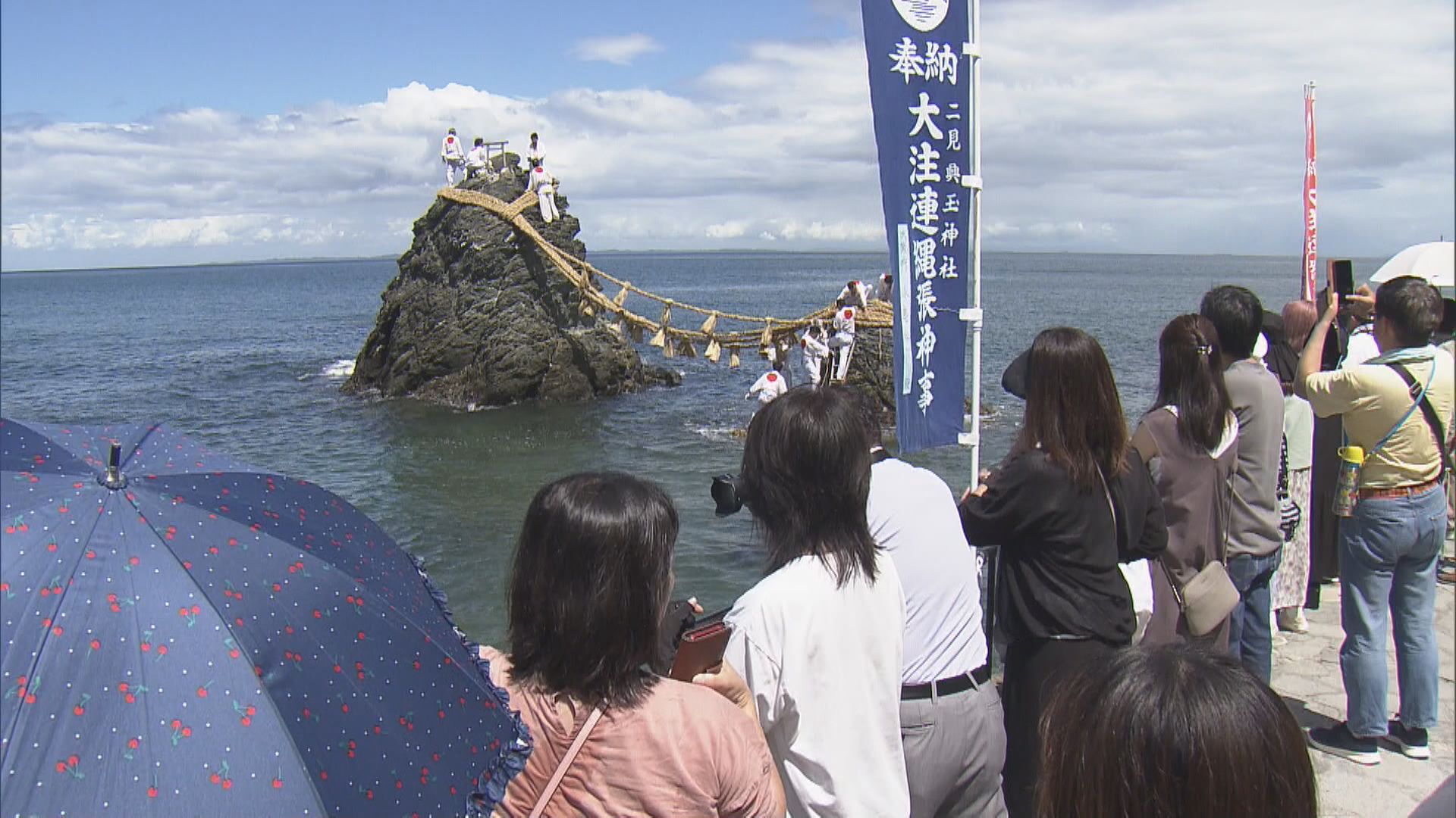5日は、ことし2度目の張り替え神事が行われ、本殿でお祓いを受けた長さ35メートル、重さ40キロの真新しい大しめ縄5本が夫婦岩まで運ばれました。