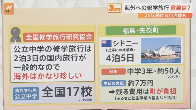 全国修学旅行研究協会に問い合わせたところ、「公立中学の修学旅行は、2泊3日の国内旅行が一般的なので、海外はかなり珍しい」ということです。