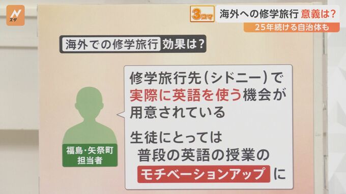 福島・矢祭町の担当者は「修学旅行先(シドニー)で、実際に英語を使う機会が用意されている。生徒にとっては、普段の英語の授業のモチベーションアップに繋がっているんじゃないか」ということでした。