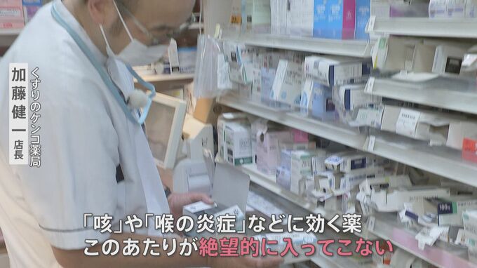 こちらの薬局では、8月に入り、コロナ患者が急増。咳止めや、のどの炎症をおさえる薬などが、発注しても届かない状態だといいます。