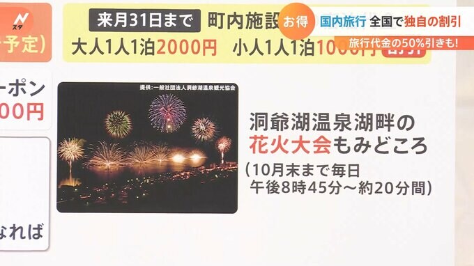 さらに、北海道の洞爺湖では「とうや湖割」。7月31日まで町内施設での宿泊代金大人1人1泊2000円、子供は1人1泊1000円割引ということで、ホームページを見てみますと、ホテルからゲストハウスまで様々な価格帯の宿泊施設で利用ができるようになっているということで20種類以上ありました。