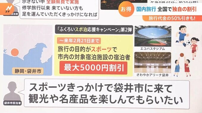 ちょっと変わった割引もあります。静岡県の袋井市では、スポーツをすると割引になる「ふくろいスポ泊応援キャンペーン」第2弾(2023年2月21日まで)が実施。旅行の目的がスポーツで、市内の対象宿泊施設の宿泊者最大5000円割引ということになります。