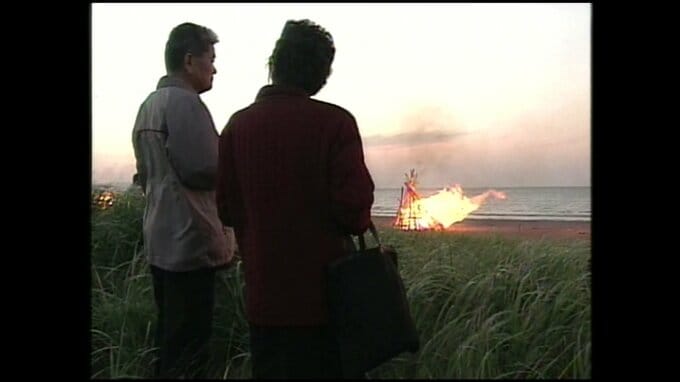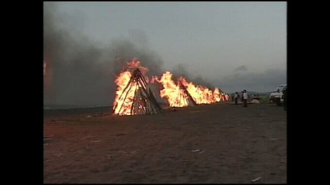 撃墜事件から20年となる2003年9月1日、晴れていればサハリンが見える稚内市の声問海岸は、いくつもの明るい炎に照らし出されました。撃墜事件の犠牲者を悼もうと、1991年から行われている、鎮魂の「野焼き」です。浜辺に立ち上る炎は、サハリン沖に沈んだ乗客乗員の魂が向かう先の、目印になっているかのようでした。