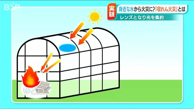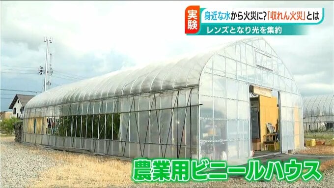 ビニールハウスの天窓に溜まったままになっていた水によって差し込んだ太陽の光が反射、または屈折。光が一点に集まって熱が蓄積することで光が当たった燃えやすいものが発火し、火事につながったということです。