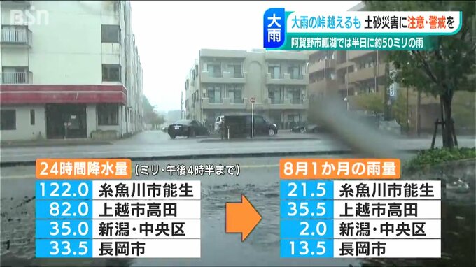 6日午後4時半までの24時間に降った雨の量は糸魚川市能生で122.0ミリ、上越市高田で82ミリ、新潟市中央区で35ミリ、長岡市で33.5ミリなどとなっていて、それぞれ8月に降った雨の量を大幅に上回っています。