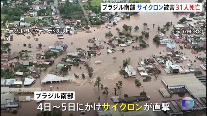 ブラジル南部を襲ったサイクロンの影響で、これまでに31人が死亡、2万5000人以上が避難しています。ブラジル南部では4日から5日にかけサイクロンが直撃し、地元メディアによりますと、6日までに31人が死亡しました…