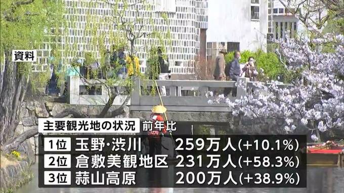 主な観光地では行動制限の緩和により、玉野市の深山公園の利用客が大幅に増えたことなどから、渋川周辺が最も多くなっています。観光客の消費額は1673億円で前の年に比べ47%余り増加しました。岡山県観光課ではインバウンド客の増加などで引き続き回復は続くと分析しています。