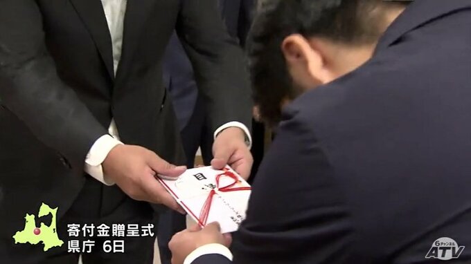世界文化遺産の「北海道・北東北の縄文遺跡群」を構成する青森市の三内丸山遺跡の保全に役立ててもらおうと、大手食品メーカーが青森県に寄付金を贈呈しました。寄付金を贈呈したのはサントリーフーズ東北支社です…