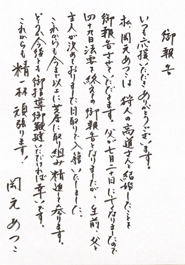 また、岡本さんも直筆の報告文をアップし「いつも応援いただきありがとうございます。私、岡元あつこは狩人の高道さんと結婚したことを御報告させていただきます。父が七月二十日に亡くなりましたので四十九日法要を終えての御報告となりましたが、生前、父と主人が決めておりました日取りで入籍いたしました」と、綴りました。