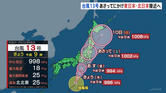 台風13号はあさってにかけて、東日本や北日本に接近するおそれがあります。伊豆諸島では引き続き、あす午前中にかけて線状降水帯が発生する可能性があり、土砂災害などに厳重な警戒が必要です。気象庁によりますと…