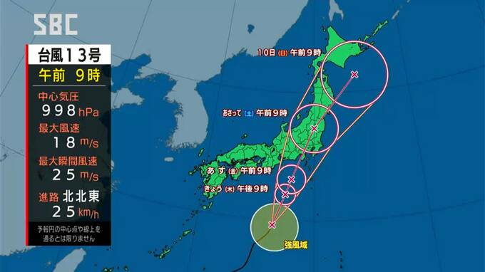 台風13号は時速およそ25キロの速さで北北東に進んでいて、8日夜から9日にかけ県内に最も接近する見込みです。