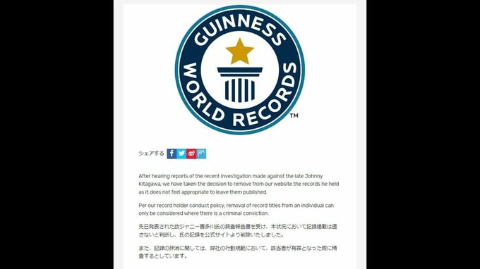 故ジャニー喜多川氏による性加害問題を受け、「ギネスワールドレコーズ」は、同氏の記録を公式サイトから削除したことをHPで公表しました。 ジャニー氏は、「最も多くのNo.1シングルをプロデュースした人物」な…
