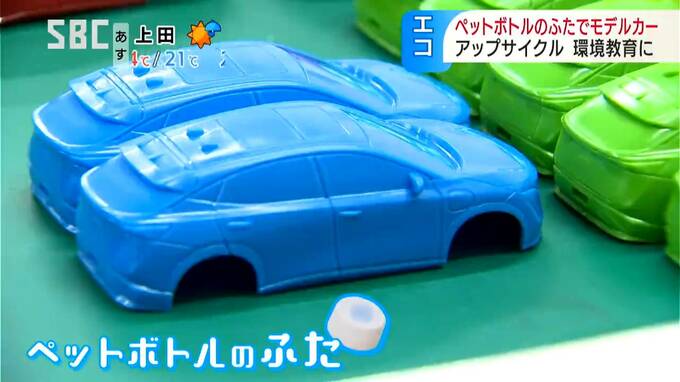 使用済みのペットボトルのふたを使って、環境教育の教材として使われる電気自動車のモデルカー作りが行われています。