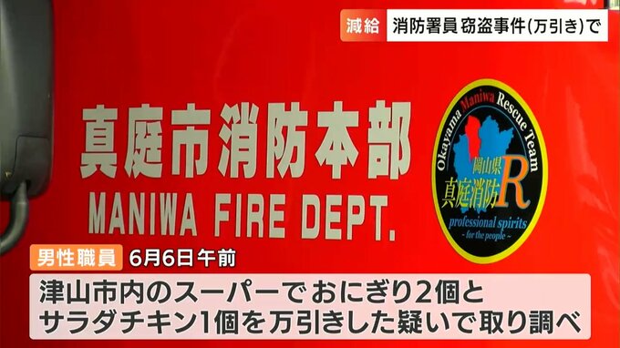 真庭市消防本部によりますと、男性職員は今年6月6日の午前、津山市内のスーパーでおにぎりとサラダチキンを万引きした疑いで警察の取り調べを受けたということです。