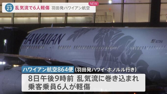 警視庁などによりますと、8日午後9時前、羽田発ハワイ・ホノルル行きのハワイアン航空864便が乱気流に巻き込まれ、乗客乗員合わせて6人が軽傷を負いました。864便は乗客乗員264人を乗せ、午後8時半ごろに離陸して…