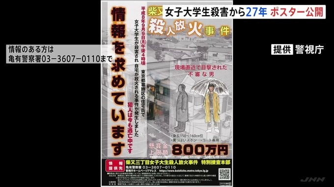 東京・葛飾区で上智大学の女子大学生が殺害された事件から27年目のきょう、警視庁が情報提供を求める新たなポスターを公開しました。この事件は1996年9月9日葛飾区柴又の住宅で当時、上智大学4年生の小林順子さん(…