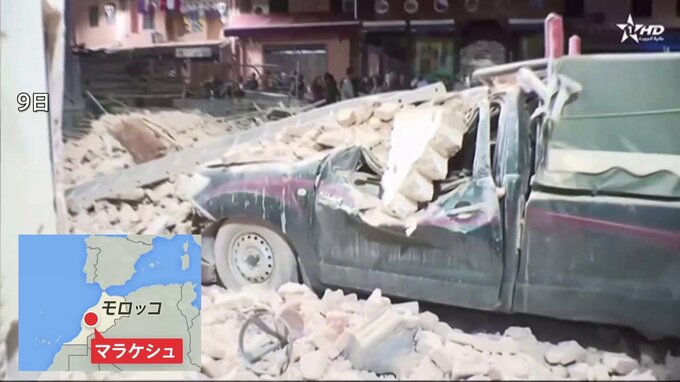 日本時間きょう午前、北アフリカのモロッコ中部でマグニチュード6.8の地震があり、600人以上が死亡しました。モロッコの中部の都市、マラケシュで地震直後に撮影された映像。つぶれた車に大量のがれきが乗っていま…
