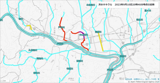 また「洪水キキクル」をみても一部で「危険」を示す紫色が広がっています。