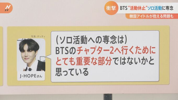 ただ、いつも必ずネガティブなことばかりを言わないのが、J‐HOPEさんなんですね。ソロ活動について、「(ソロ活動への専念は)BTSのチャプター2へ行くためにとても重要な部分ではないかと思っている」というふうに語りました。