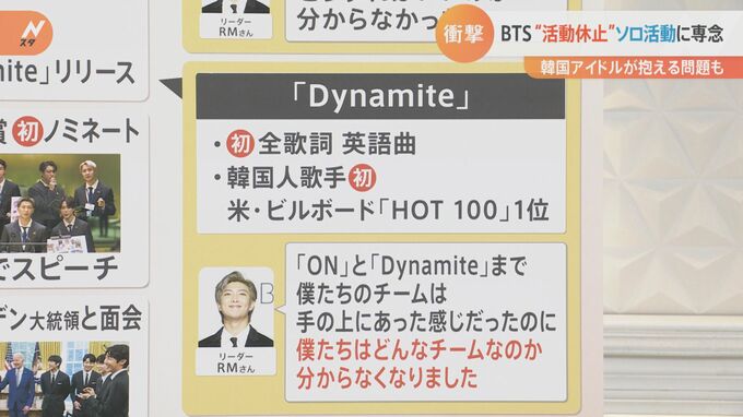 ただ実は、同じ年にまた大きな出来事がありました、それが8月。日本でもここで有名になったと言ってもいいかもしれませんね、「Dynamite」のリリースです。世界的な大ヒットとなりました。この「Dynamite」、実は初めて全歌詞が英語曲という、BTSにしては大変珍しい曲調でした。そして、韓国人歌手として初めてアメリカビルボードの「Hot 100」1位を獲得しました。本当にここで上り詰めたんじゃないかという感じがあるわけですね。しかし、リーダーのRMさんは「この『ON』と『Dynamite』まで、僕たちのチームは手の上にあった感じだったのに、僕たちのチームはどんなチームなのか分からなくなりました」と話しました。特にRMさんはほとんどの作詞などに関わっているので、どういったものを発信していくのか。自分たちが何者なのかが分からなくなったと、この会食の中で話していました。