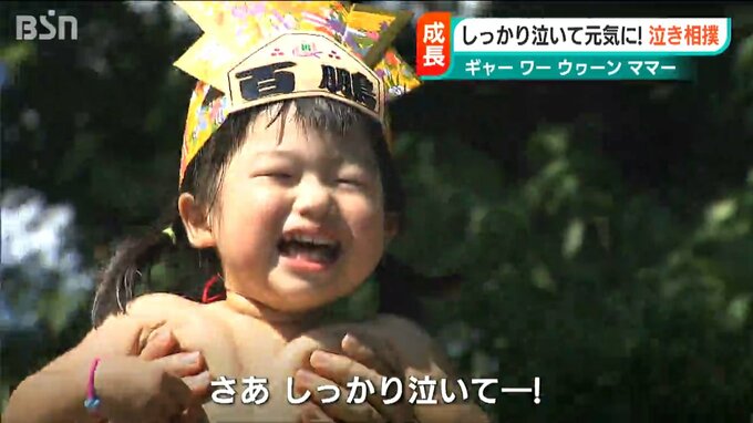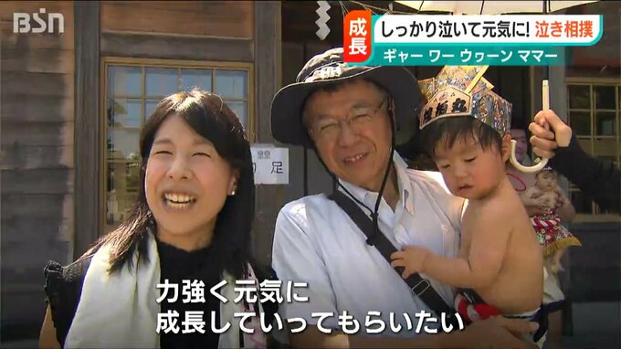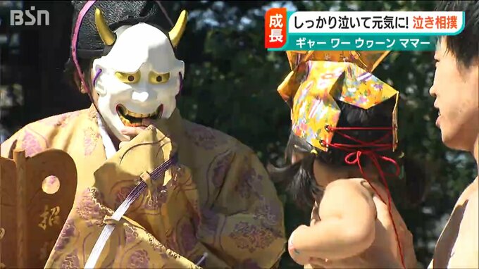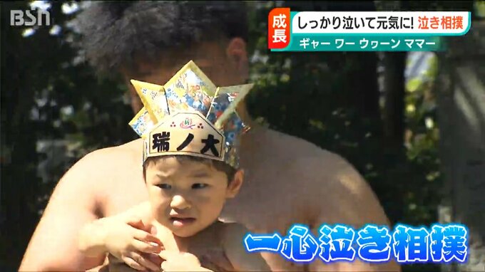 元気よく泣いていますね。子どもの健やかな成長を願う「泣き相撲」です。