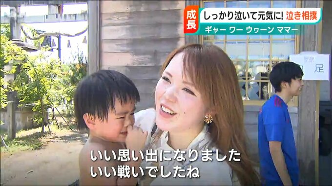 子どもを抱き上げているのは新大相撲部の皆さん。行司は勝敗はつけません。取組前、大声を上げて泣いていたこちらの子ども。いざ土俵に上がると…