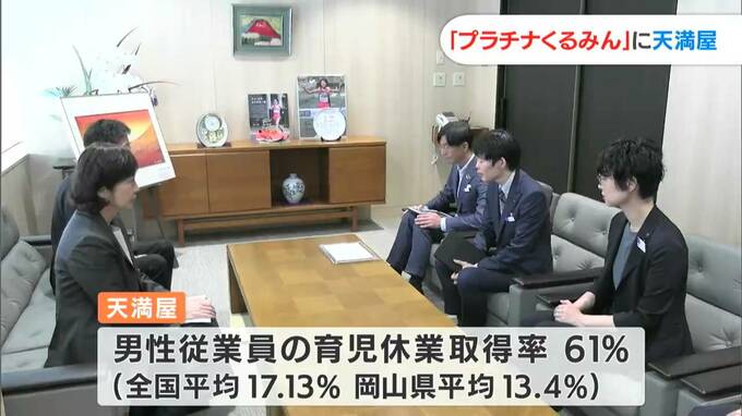 より高い水準の子育てサポート企業として岡山労働局から「プラチナくるみん」の認定を受けた、天満屋です。男性従業員の育児休業取得率が61%と全国や岡山県の平均と比べて高いことなどが評価されました。