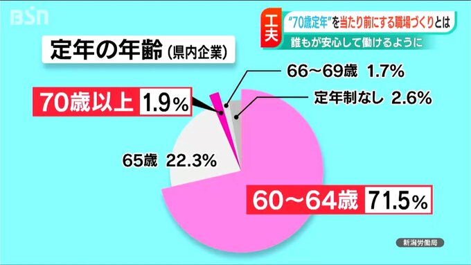 新潟労働局によりますと、新潟県内の企業が定める定年の年齢は、65歳未満が71.5%と圧倒的に多く、次いで65歳が22.3%。「新潟アパタイト」のように70歳を定年としているのは、わずか1.9%です。