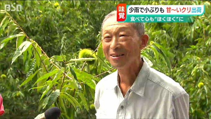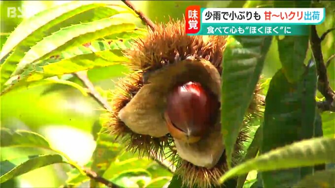 加茂市下土倉の山間部の広大な敷地で11日、秋の味覚「クリ」の早生品種の収穫が始まりました。クリは水分を含むことで大きくなるため、今年は梅雨明けからの雨が少なく例年より小ぶりとなり、収穫量としては2割ほど少なくなる見込みです。