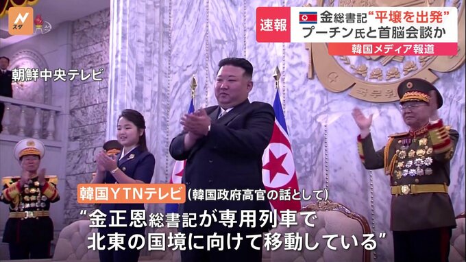 北朝鮮の金正恩総書記がロシアのプーチン大統領との首脳会談を行うため、首都・平壌を出発したと韓国メディアが報じました。韓国YTNは、北朝鮮の金正恩総書記が専用列車で北東の国境に向けてゆっくり移動している…