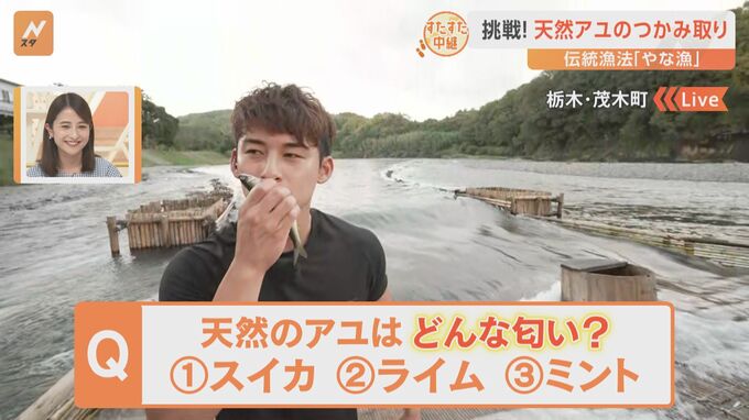 「歩いて発見!すたすた中継」。栃木県茂木町の那珂川にある「やな場」で天然アユのつかみ取りに挑戦!定番の塩焼きや珍しい刺身などグルメも堪能。
