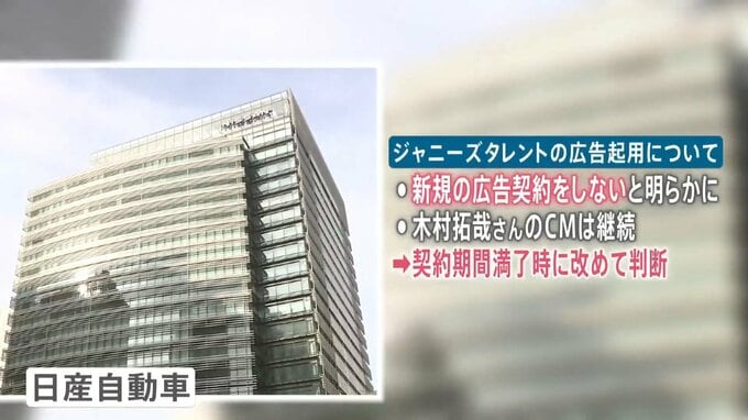 「日産自動車」はジャニーズ事務所の所属タレントとの新規の広告契約をしないと明らかにしました。木村拓哉さんのCMは続け、契約期間が満了した時点で改めて判断するということです。