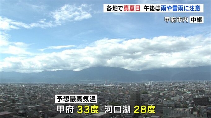 予想最高気温は甲府で33度、河口湖で28度となっています。