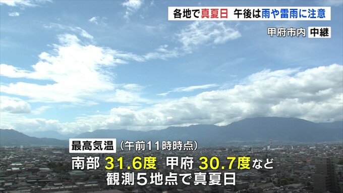 きょうの県内は高気圧に緩やかに覆われています。12日午前11時時点の最高気温は南部で31.6度、甲府で30.7度など観測5地点で30度を超えています。