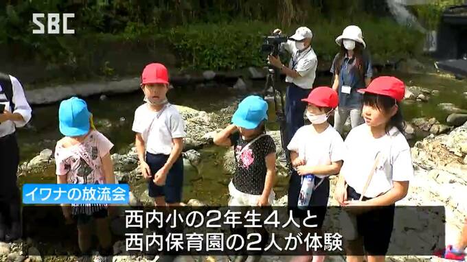 参加した2年生4人と、あわせて招待された西内保育園の園児2人が、イワナ10キロを川に放ちました。