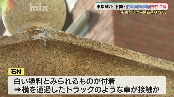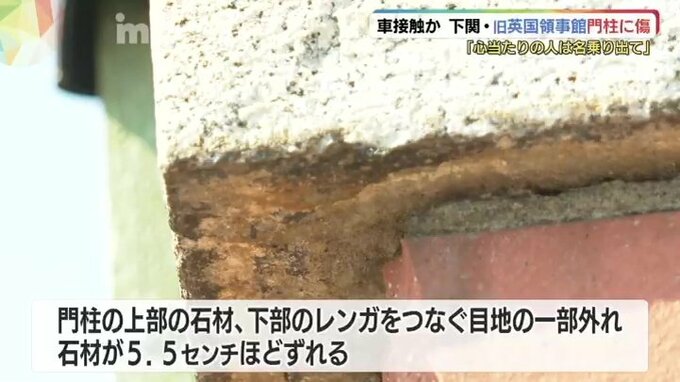車が接触したような跡があり、下関市は、国などと修復に向けた協議を進めています。旧領事館の指定管理者によりますと、9月8日の朝、出勤してきたスタッフが、右側の門柱の破損に気づきました。