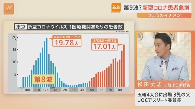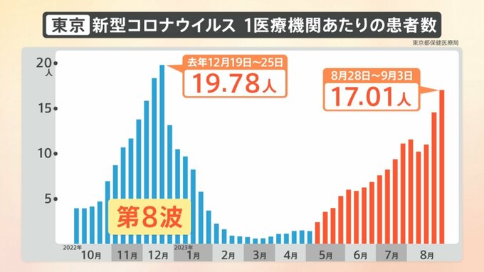第8波のピークだった▼2022年12月19日~25日は19.78人でしたが、2023年8月28日~9月3日は17.01人と迫っている状況になっています。※東京都保健医療局
