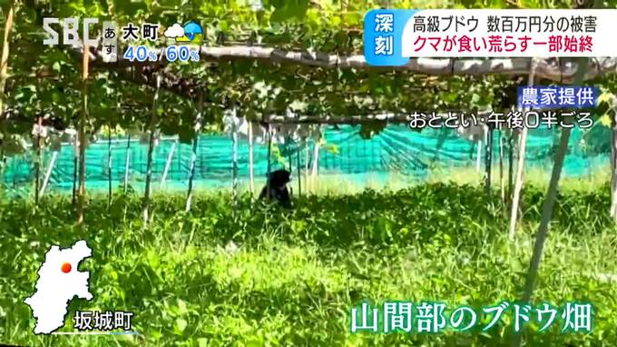 一部始終を撮影 クマが高級品種「ナガノパープル」食い荒らす 被害額は数百万円に To view this video please enable JavaScript, and consider upgrading to a web browser that supports HTML5 video 信越放送 2023年9月12日(火) 19:50 国内 坂城町の畑で撮影された、クマがブドウを食べる瞬間の映像です。 この畑では、8月末から被害が相次ぎ、被害額は数百万円に上るとみられています。 坂城町の役場からおよそ2キロほどの山間部にあるブドウ畑。 映像の奥でうごめいている黒い獣はクマです。
