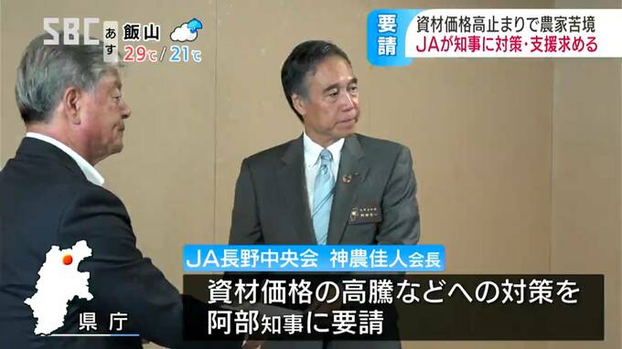 資材などの価格の高止まりで、県内の農家も厳しい状況が続く中、JA長野中央会は、阿部知事に対策や支援を求めました。