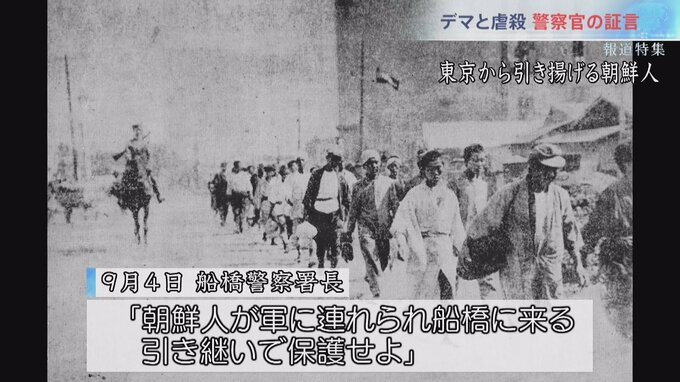 「(自警団は)周りを見ながら、どこに朝鮮人がいるか探したわけだよ。それをやるのに、誰かが鐘を叩いたわけ。音がしましたよ。人が来た来た、たまげたよ」