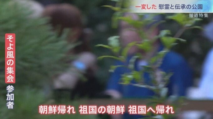 2017年を境に、公園内の雰囲気は一変しました。「6000人の虐殺はなかった」と主張する団体「そよ風」が朝鮮人虐殺の追悼式と同じ時間、わずか20メートル先で新たな活動を始めたのです。そよ風は朝鮮人犠牲者の追悼碑の撤去を求めていました。