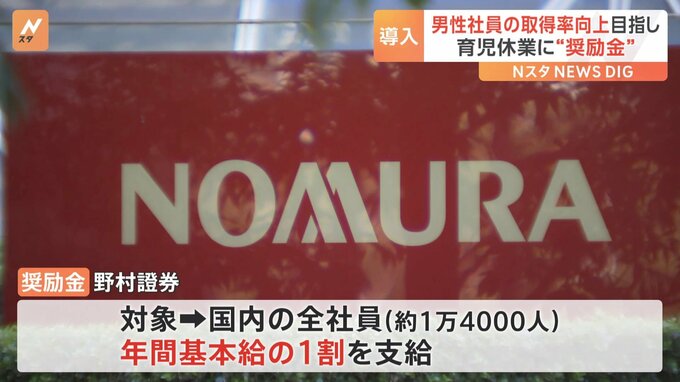 証券最大手の「野村證券」が育児休業の取得を男性社員に浸透させるため、奨励金の支給を始めます。野村ホールディングス傘下の野村證券は、育児休業を1か月以上取得した社員に奨励金を支給する制度を発表しました…