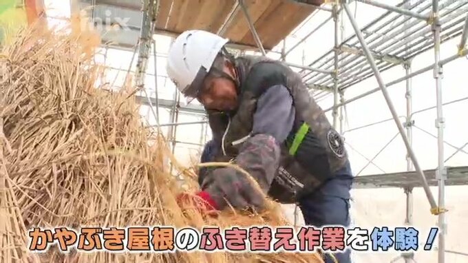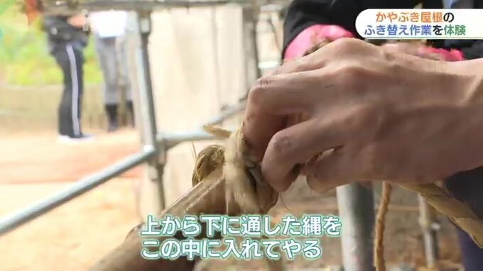 職人「かやぶきの屋根は角結びに始まり、角結びに終わるといわれるぐらい重要な結び方で何千か所っていうふうに屋根の方で結んでいくやり方になります」